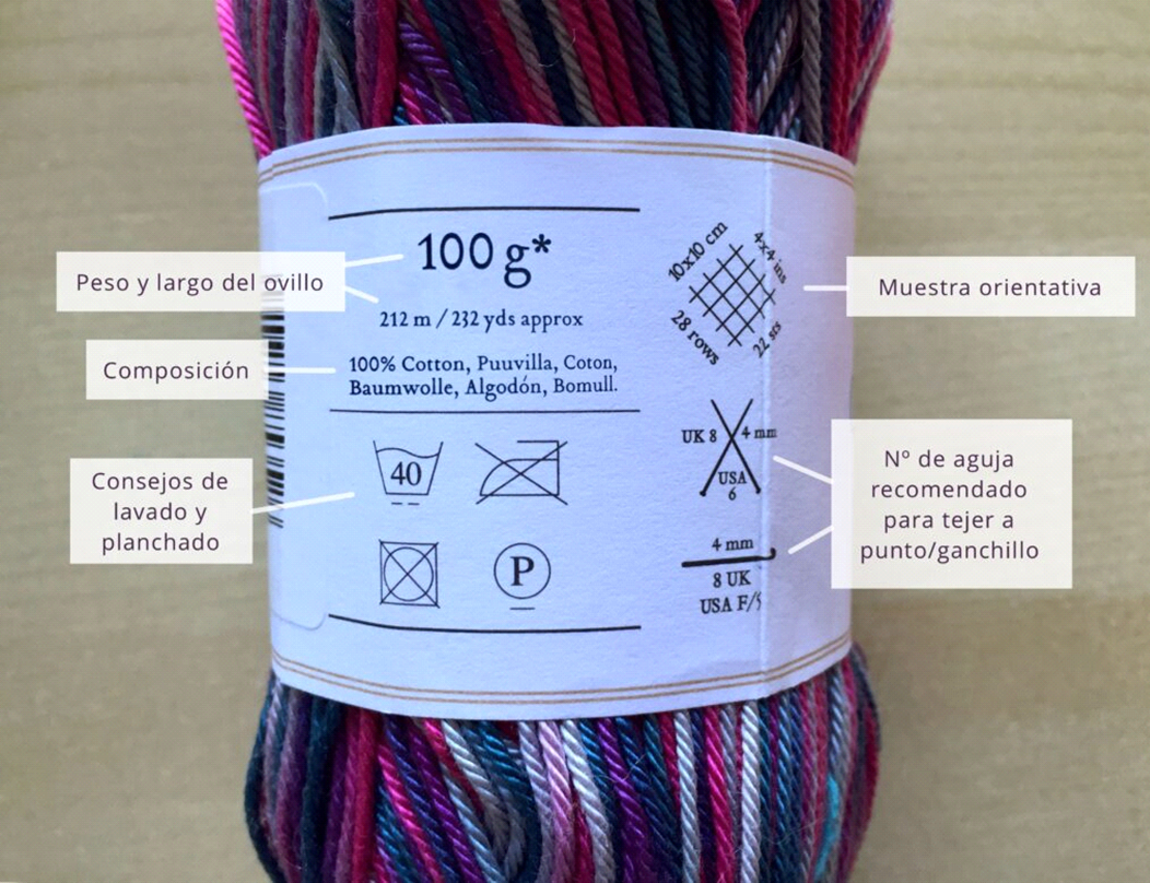 En la faja que trae el ovillo, tenemos información muy importante a la hora de pensar en nuestro proyecto y de saber que aguja vamos a utilizar.