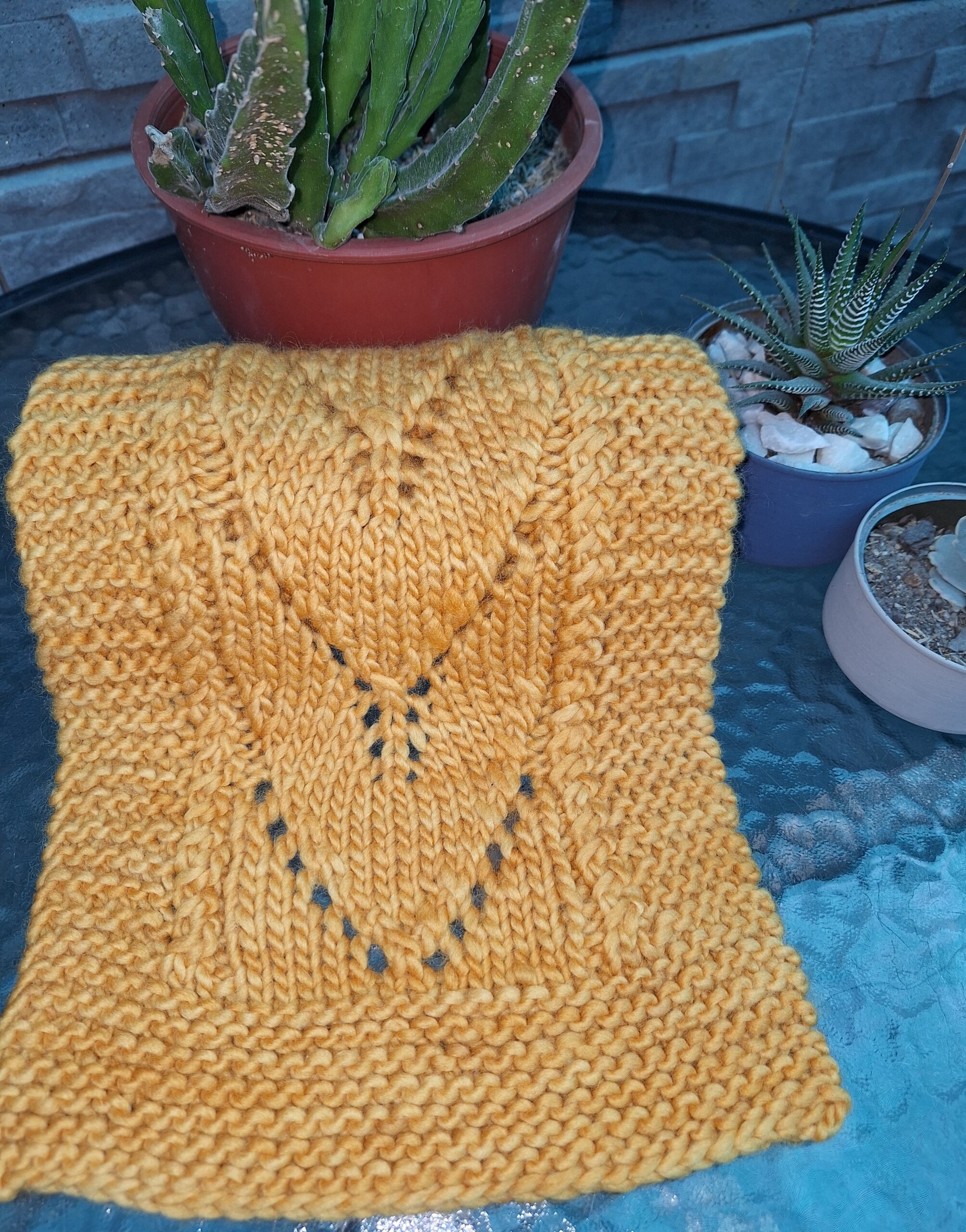 Bufanda tejida a 2 agujas, con diseño calado y puntos fantasía.